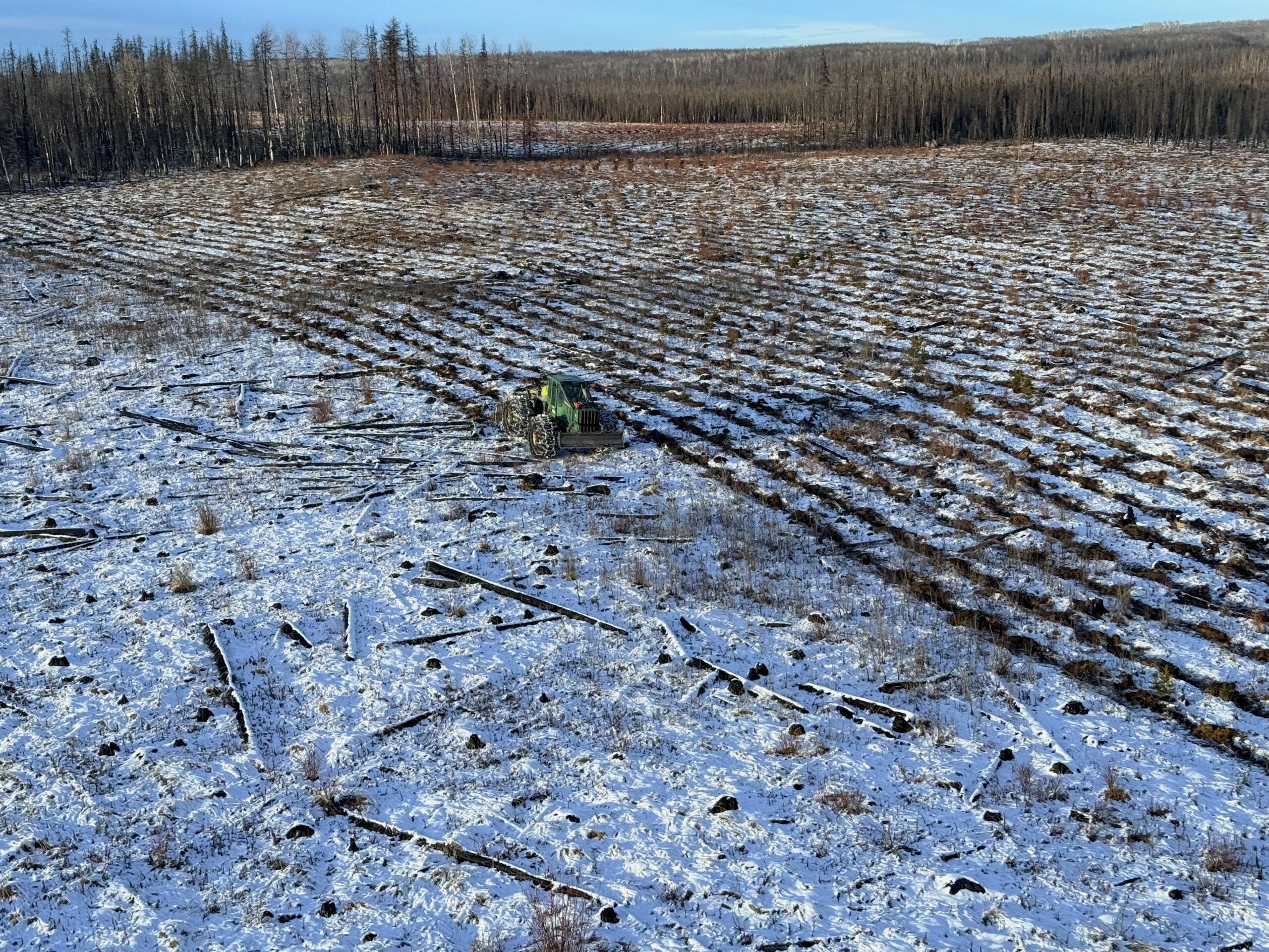 Our summer fleet includes three John Deere 748H skidders equipped with Bracke Forest 24.a mounders. Each unit is fitted with flotation tires to minimize soil impact. On average, we produce 1,000 –1,800 mounds per hectare and cover approximately 15 hectares per day.